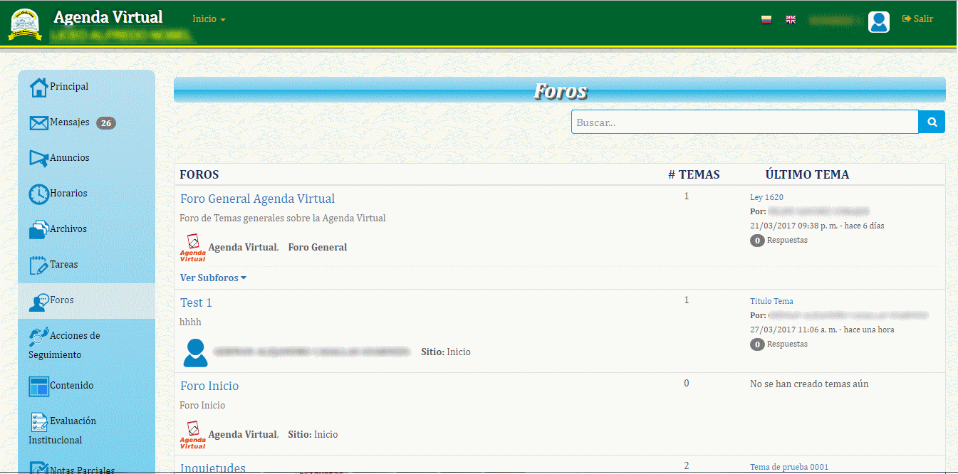 Para ingresar al módulo de Foros, debe hacer click en el botón "Foros" ubicado en el menú principal.